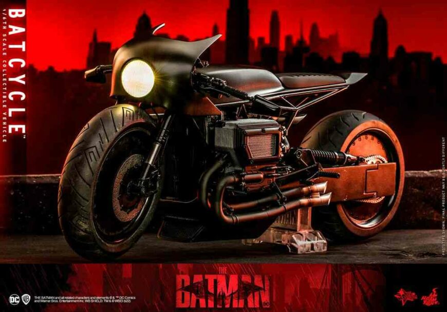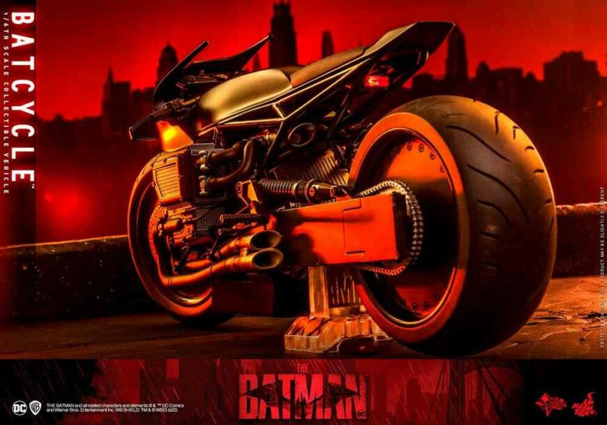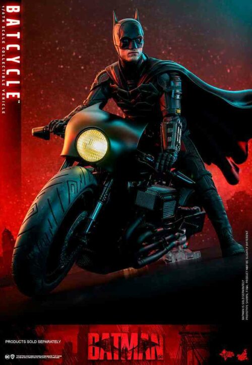 Basato sul veicolo visto nel film The Batman, il veicolo da collezione Batcycle in scala di un sesto è ricreato con estrema precisione e applicazioni di verniciatura fine, misura 42 cm di lunghezza, presenta un design della funzione di illuminazione a LED sulla testa e sulle luci posteriori, manubrio regolabile in grado, ruote in gomma girevoli con un disegno realistico del battistrada, anche dettagli meccanici altamente accurati mostrati sul motore, Telaio, cruscotto e scarico, viene fornito con basi di visualizzazione.