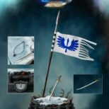 diorama- 1x bandiera in tessuto con fili metallici all’interno, accompagnata da un palo metallico che può essere staccato dalla base del diorama- 1x spada staccabile dalla base