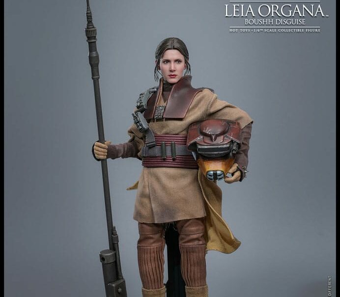 Sideshow and Hot Toys are proud to present the Leia Organa (Boushh Disguise)™ Sixth Scale Collectible Figure. The Star Wars action figure features a newly developed helmeted head with detailed weathering, as well as a separate unhelmeted head sculpt of Carrie Fisher as Leia, complemented by separate rolling eyeballs, a lifelike expression, and a meticulously sculpted low braided bun hairstyle.