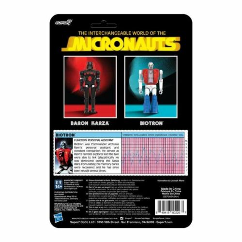 Ispirata al giocattolo vintage nela linea “Micronauti” degli anni ’70, questa figura di Biotron ReAction+ da 10cm è progettata per assomigliare al giocattolo originale e presenta una struttura O-Ring, con 12 punti di articolazione per la massima posabilità! Dotata di un accessorio treadpack e confezionata in un blister con retro in cartone, il destino del Microverso sarà letteralmente nelle vostre mani quando avrete questa figura di Biotron ReAction+!