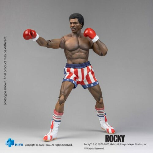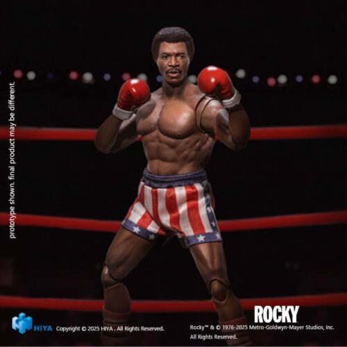 Da Rocky (1976), l’iconico campione dei pesi massimi entra nella serie EXQUISITE SUPER di Hiya Toys come action figure in scala 1/12 altamente dettagliata. Alta 16 cm, questa figura cattura la potente presenza di Apollo con una seria scultura della testa, una corporatura muscolosa e un’attrezzatura caratteristica, dai pantaloncini da boxe a stelle e strisce ai calzini a righe e alle scarpe da ginnastica alte.
