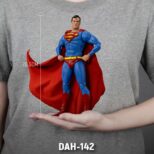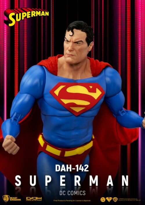 La figura DAH-142 mette in mostra il look iconico di Superman con una testa meticolosamente scolpita, uno sguardo determinato caratteristico e un classico abito blu con accenti rossi e gialli. Il famoso scudo a S sul petto e il mantello rosso in tessuto con telaio interno in filo metallico completano la sua eroica presenza.